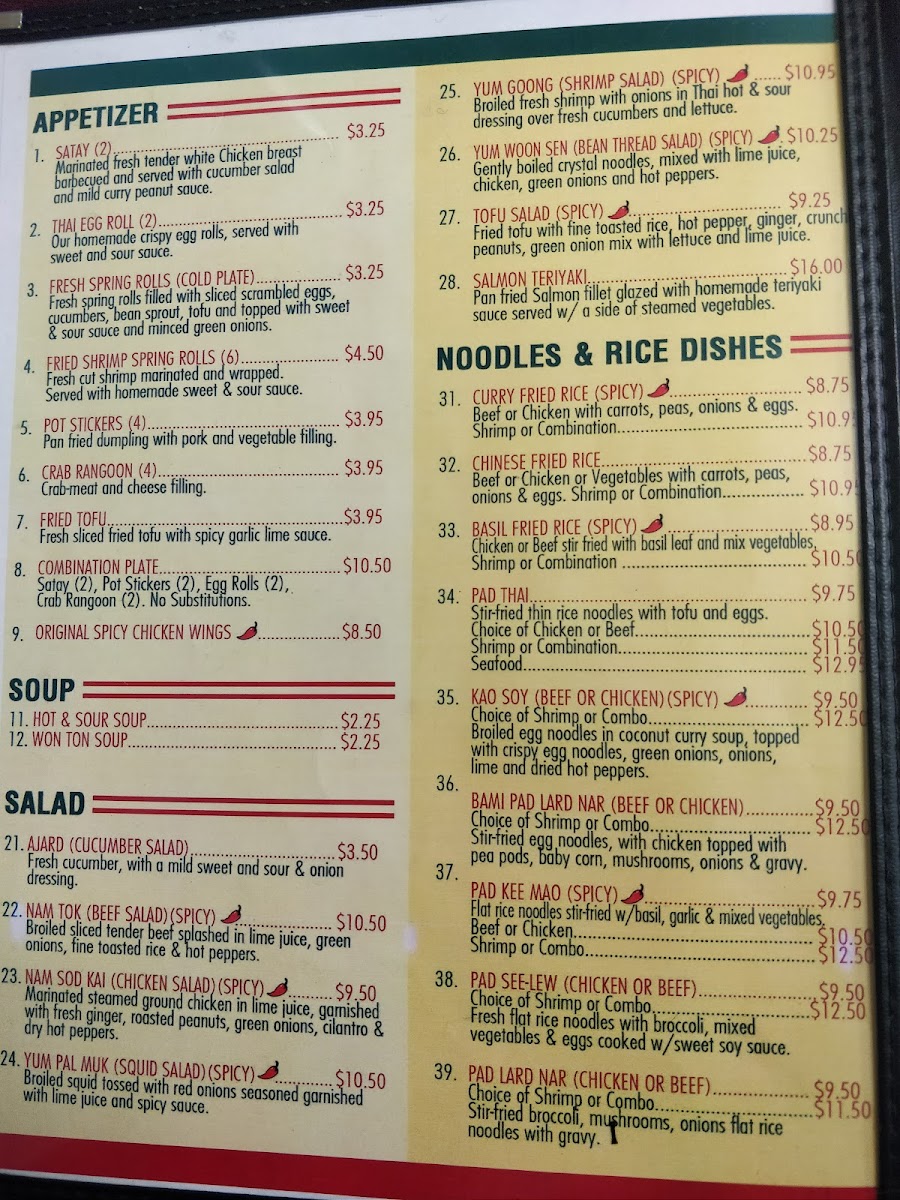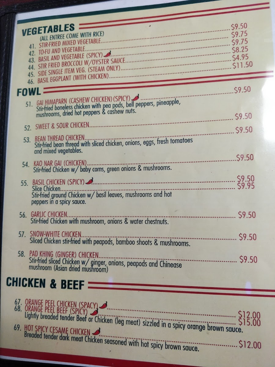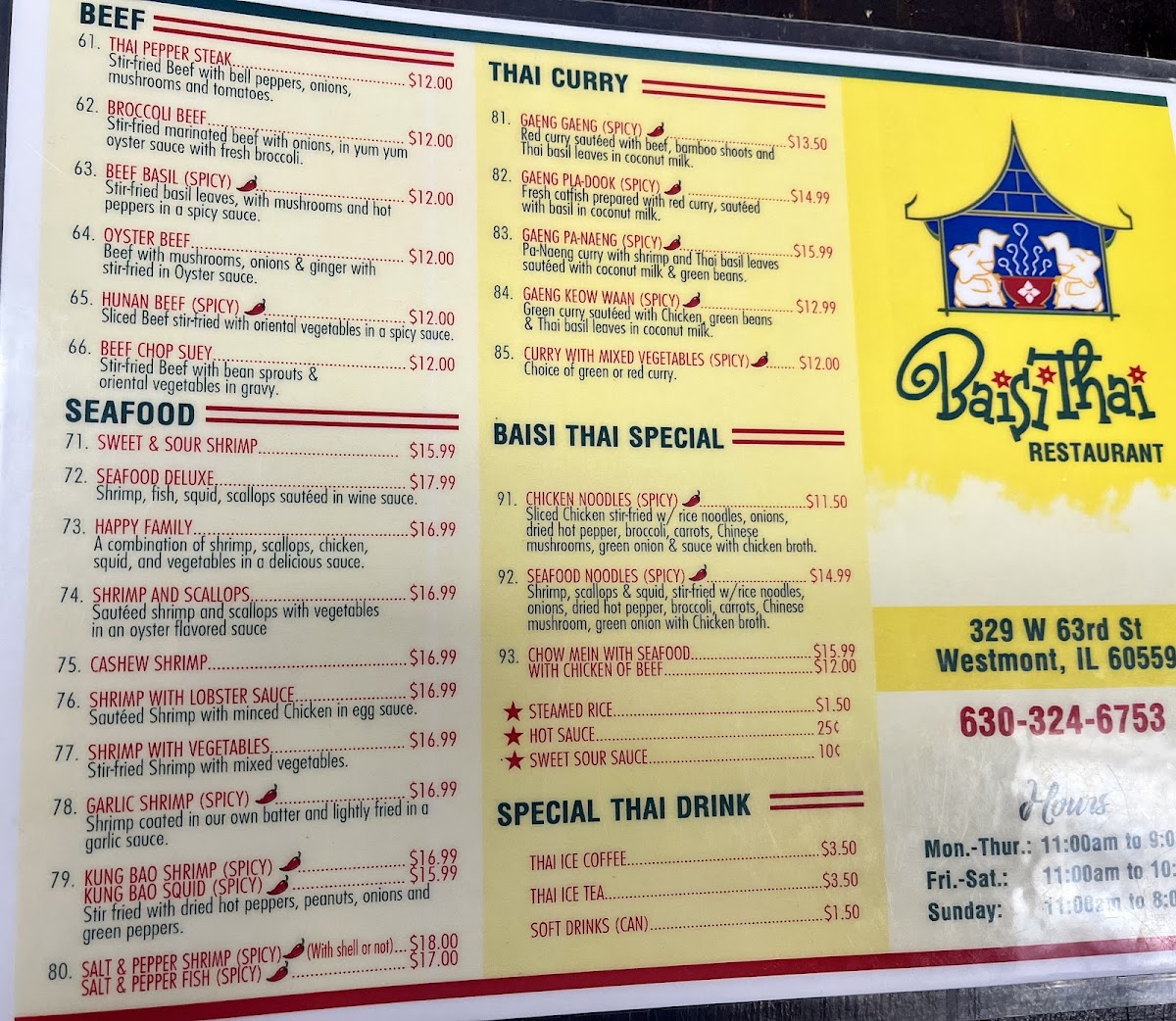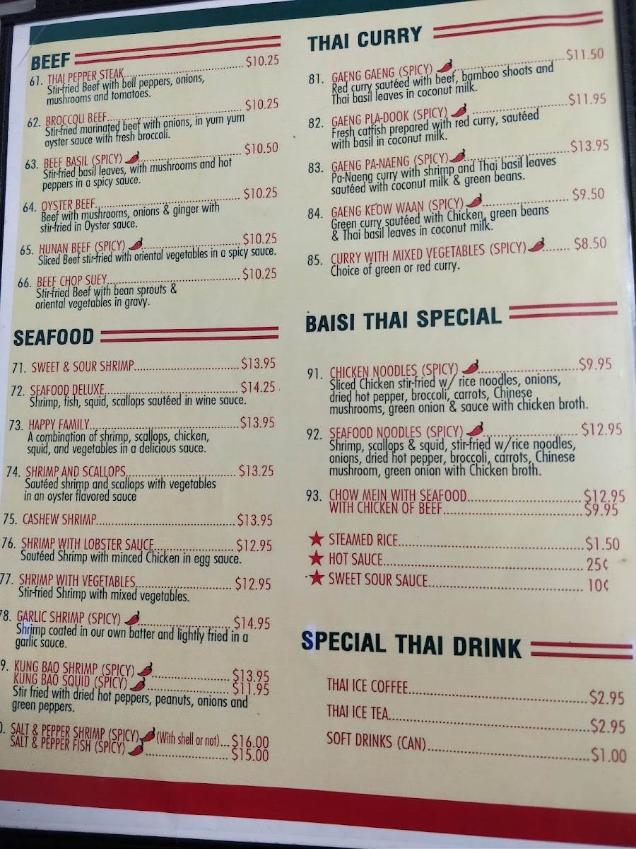 Welcome to Baisi Thai Restaurant, nestled in the heart of Westmont, IL, where we invite you to embark on a culinary journey filled with vibrant flavors and authentic Thai dishes. Located conveniently at 329 W 63rd St, our menu is a celebration of time-honored Thai cuisine complemented by a contemporary twist. Whether you're a fan of zesty and aromatic dishes or crave something rich and savory, our menu features must-try specialties like the luscious Crab Rangoon, the tantalizing Drunken Noodles, and the aromatic Chicken Satay. Don't miss the creamy and spicy Kao Soy Beef or Chicken, paired perfectly with our fragrant Thai Iced Tea. Fascinated by bold spices? The Pad King Ginger Chicken and the Basil Chicken Spicy are sure to satisfy. Our diverse menu also includes the delicate Pad Thai with Shrimp and the comforting Hot and Sour Soup. For a sweet ending, indulge in a slice of our delightful Birthday Cake. Join us at Baisi Thai Restaurant, where every dish promises an explosion of flavors and a memorable dining experience.